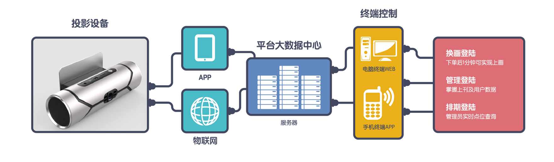 投影媒体的操控系统采用物联网操控,包含后台升级推送、数据库统计分发,支持定时开关机功能及断电保护功能。